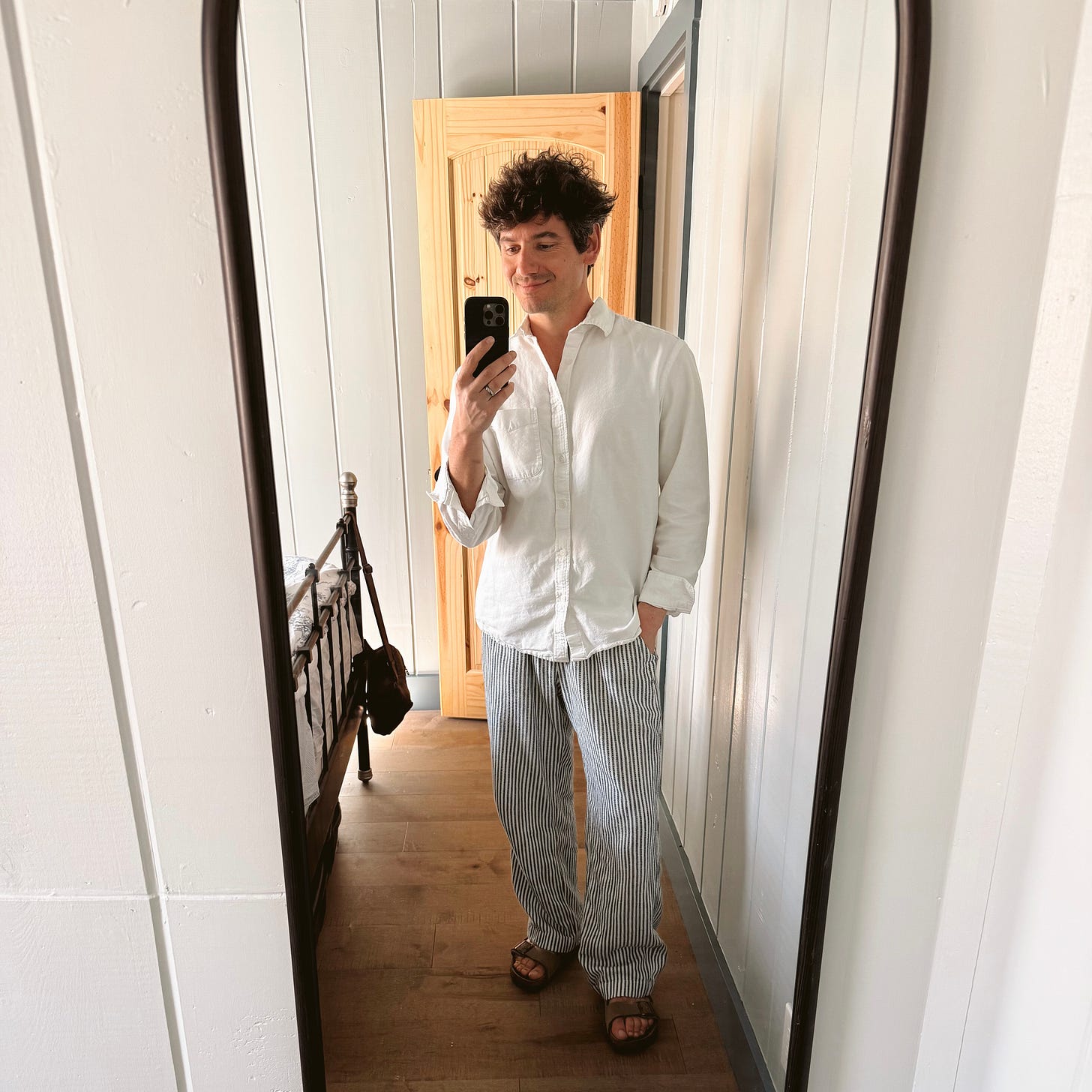The blue bedroom already looks fantastic and now I’m oddly invested in the full reveal like it’s a season finale. Also Thomas… I feel compelled to acknowledge the pants. That look somehow reads “effortlessly coastal” on you. If I attempted it, I’m fairly certain I’d look like a man who accidentally left the house wearing his father’s pajamas and decided to commit to the bit.