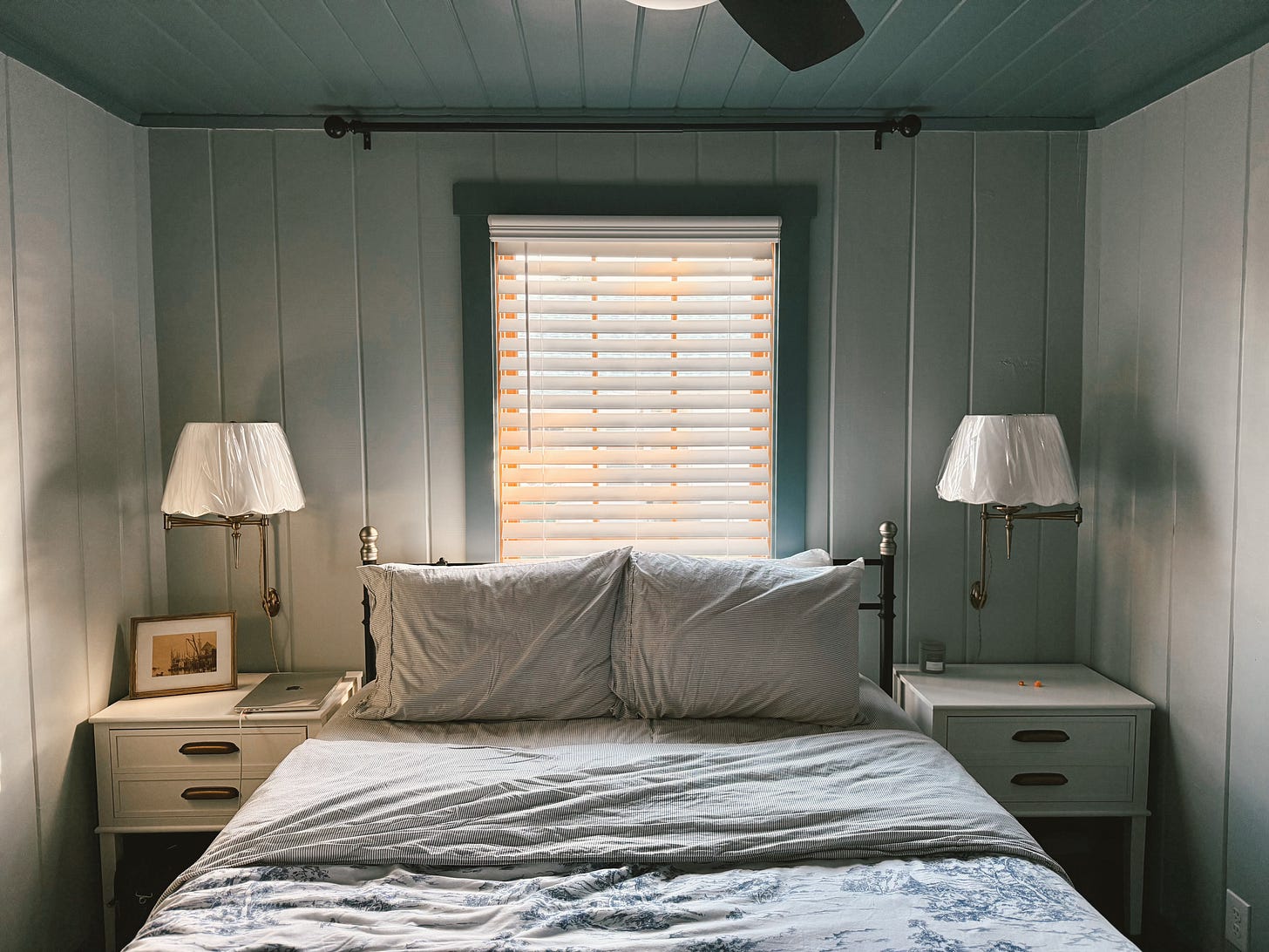 PJ’s had his eye on this specific color combo for a while, and finally got to execute his decision in our bedroom at the beach shack. It’s light blue on the walls and a darker, moodier blue on the trim and ceiling. We were SO skeptical about it at first, changing our minds at least three times during the painting process, but I am so happy we stuck to our guts and saw the vision through. We both LOVE it and agree it has a lot more character than our previous all-white room did. We just put the curtains up a midnight last night (and took the plastic off the lamp shades), so this photo is a little bit out of date, but I’ll post the finished room in next week’s newsletter. We love the way it turned out!